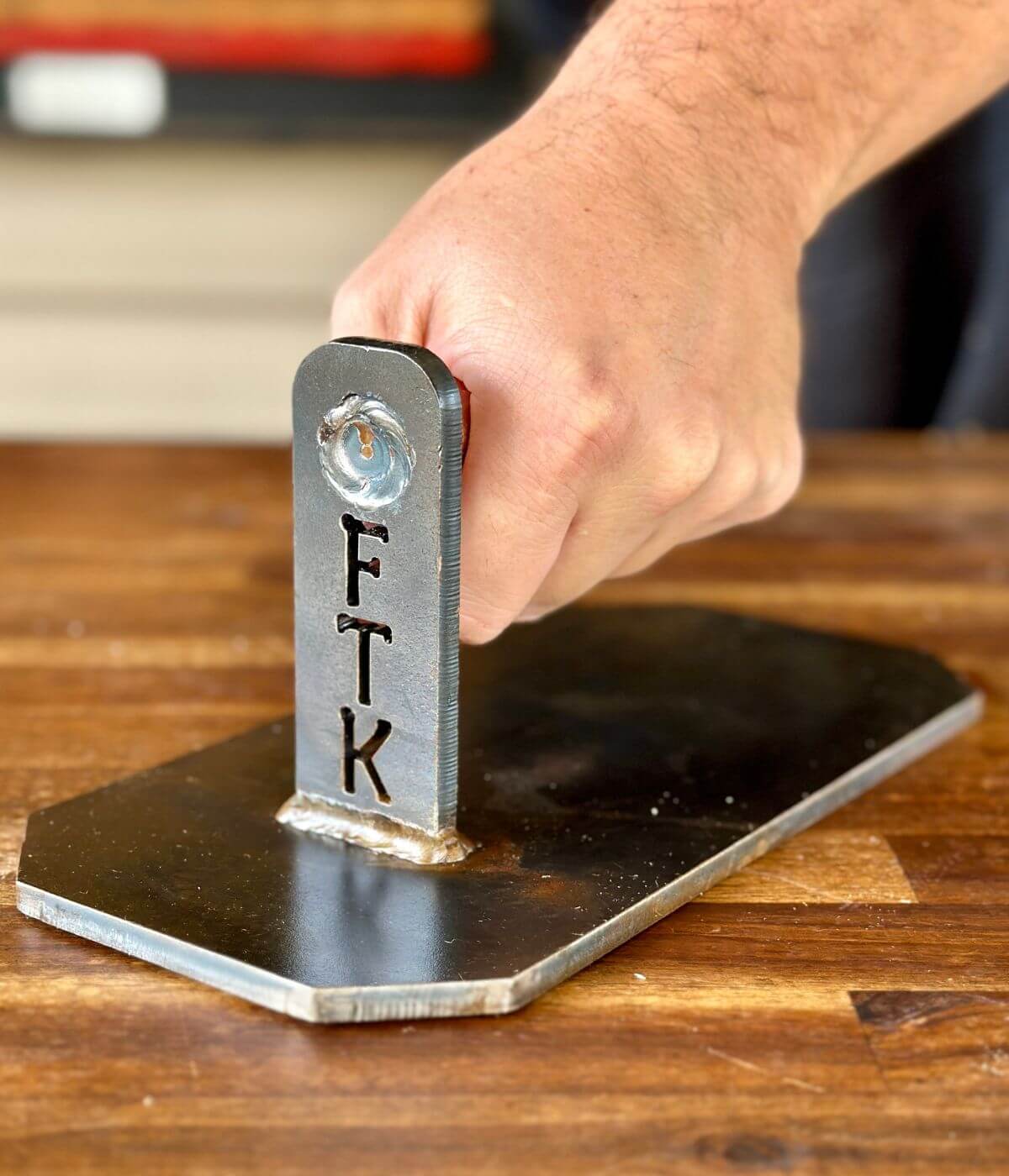 This burger press is handcrafted in a metal shop specializing in custom-designed pits, right down the street from our house.